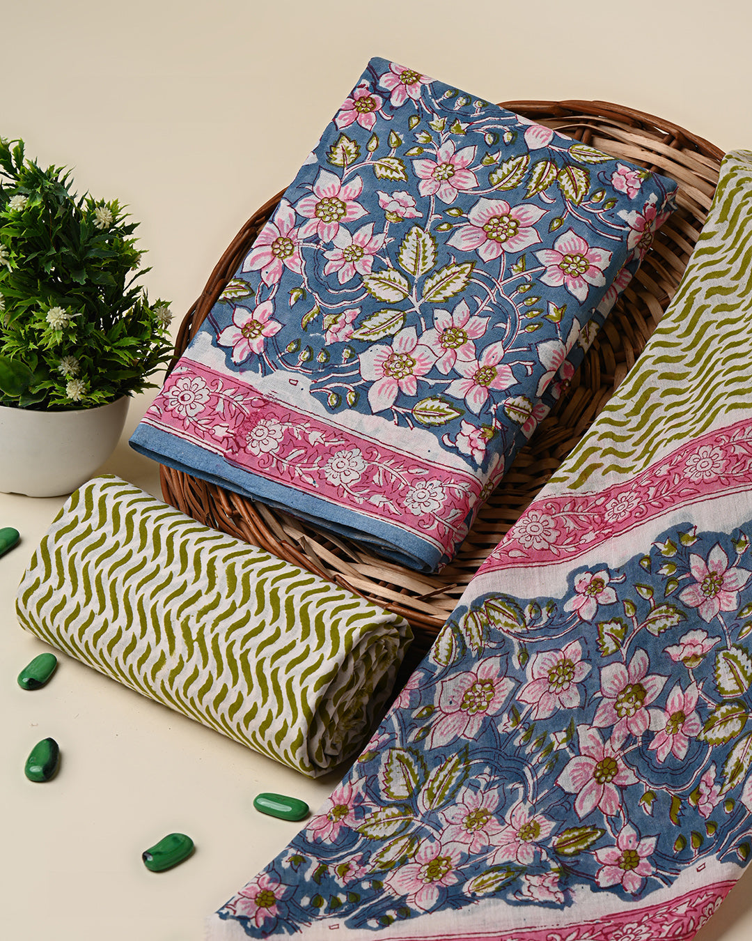Blue and Pink Floral Hand Block Print Cotton Suit Sets With Cotton Dupatta CFCOTMU54